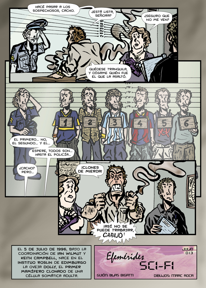 ¡Muy bueno! Al ver la fila de sospechosos y al policía ya pensé que había algo sospechoso (valga la redundancia) en la similitud de los rostros. ¿Sufrirán estos clones los mismos problemas que acabó padeciendo la ovejita Dolly..?