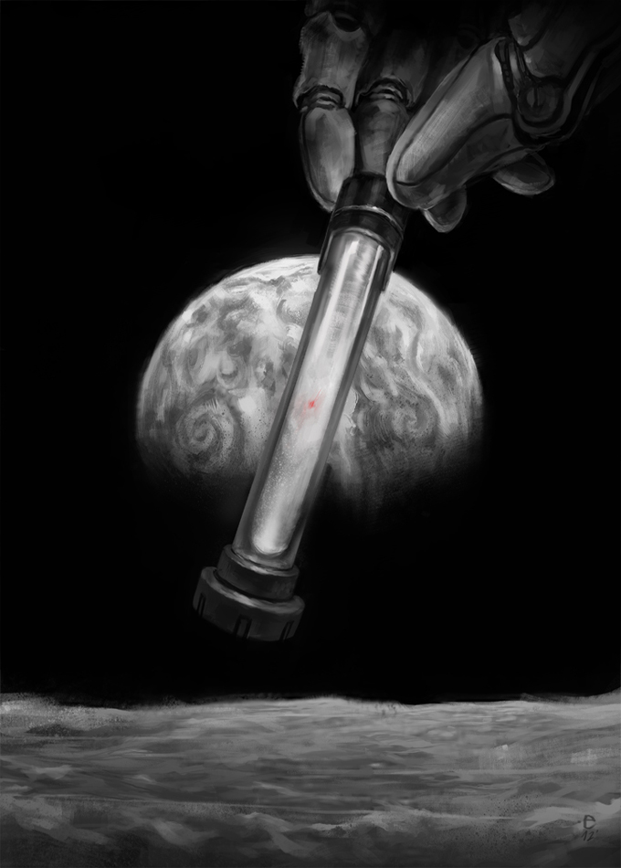 En esos momentos de añoranza, M-7 extrae de su compartimento de almacenaje, situado por encima del rotor de la cadera izquierda, su tesoro más preciado. Abre un estuche y retira una probeta encerrada en él, protegida por un material esponjoso. Afina sus visores a la potencia requerida y contempla las células enclaustradas que dan cuerpo a un pequeño mundo rebosante de intencionalidad, de una prometedora y balbuceante obstinación de vida que algún día, cuando todo se olvide, podría eclosionar. El óvulo fecundado de Gretel es hermoso, una esfera perfecta color sangre.